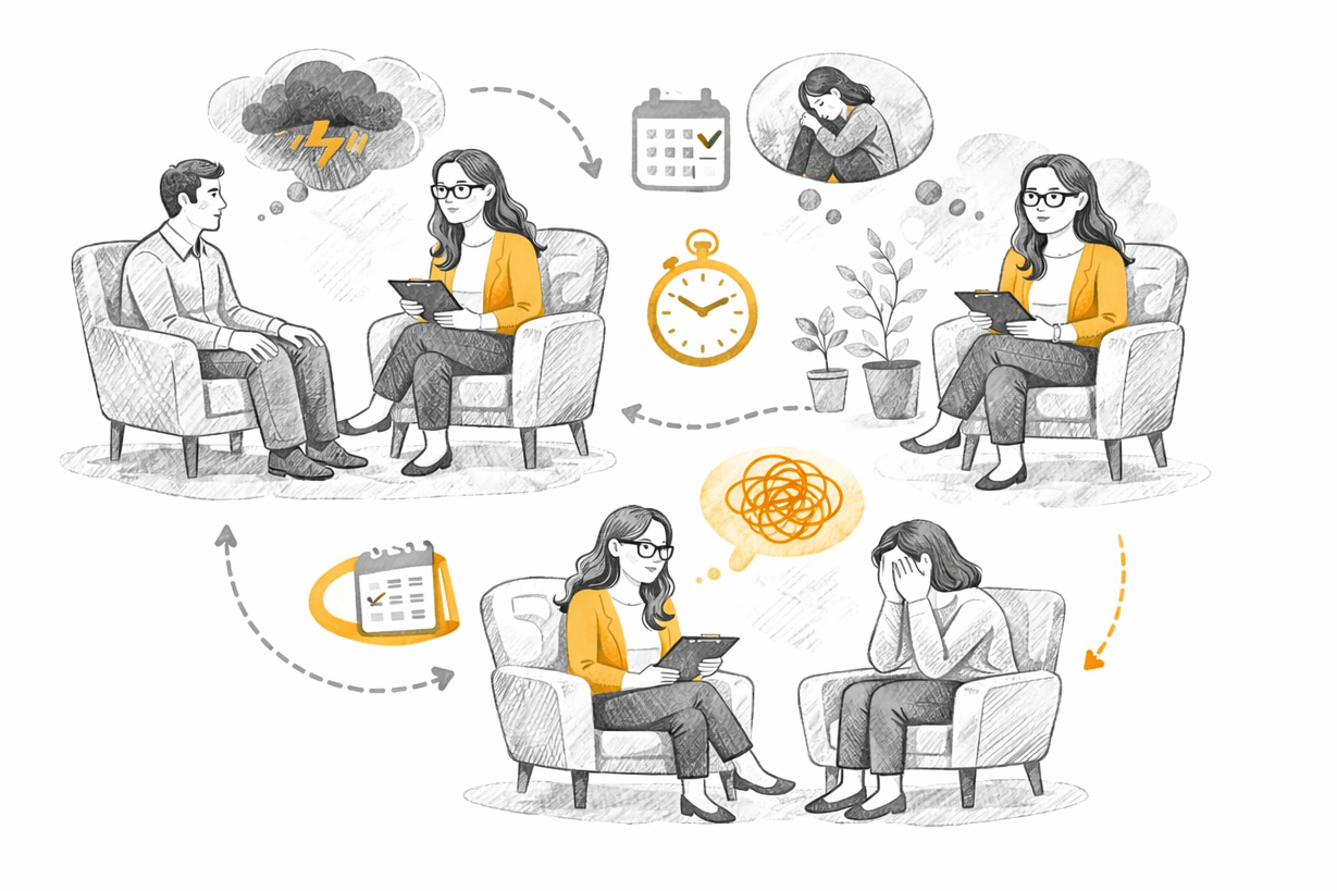Zazwyczaj psychoterapia indywidualna rozpoczyna się jednym lub kilkoma spotkaniami wstępnymi, zwanymi konsultacjami albo wywiadem. Spotkania odbywają się zwyczajowo z częstotliwością jednego, rzadziej dwóch spotkań w tygodniu, trwających zwykle 50 minut.